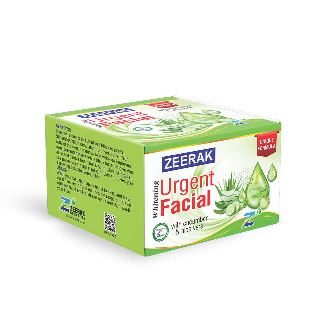Get a salon-quality glow in just 5 minutes with the Zeerak Whitening Urgent Facial. This unique formula is packed with the calming, nourishing power of Cucumber & Aloe Vera to instantly refresh and revitalize dull skin. It is designed to deliver a deep cleanse, remove dirt and dead cell blockages, and stimulate blood circulation. Regular use helps to improve skin texture, visibly reduce fine lines, and give the skin a healthy, glowing, beautiful young look. The Whitening complex works to instantly brighten the skin tone and reduce the appearance of blackheads and pimples.